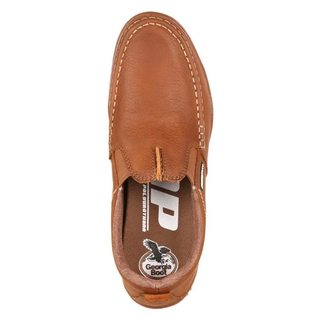 The Cedar Falls collection is the most comfortable shoe available from Georgia Boot. Whether relaxing at day’s end or seeking all-day comfort, the Georgia Cedar Falls Moc-Toe Slip-On offers a deconstructed casual upper and unique memory foam topped AMP (advanced memory polyurethane) footbed. A full-grain tan leather upper keeps this shoe stylish. Combined with the lightweight rubber outsole, these mocs are appropriate for leaving the house, though it may feel like you’re wearing your slippers. Cedar Falls. Feel the Comfort.